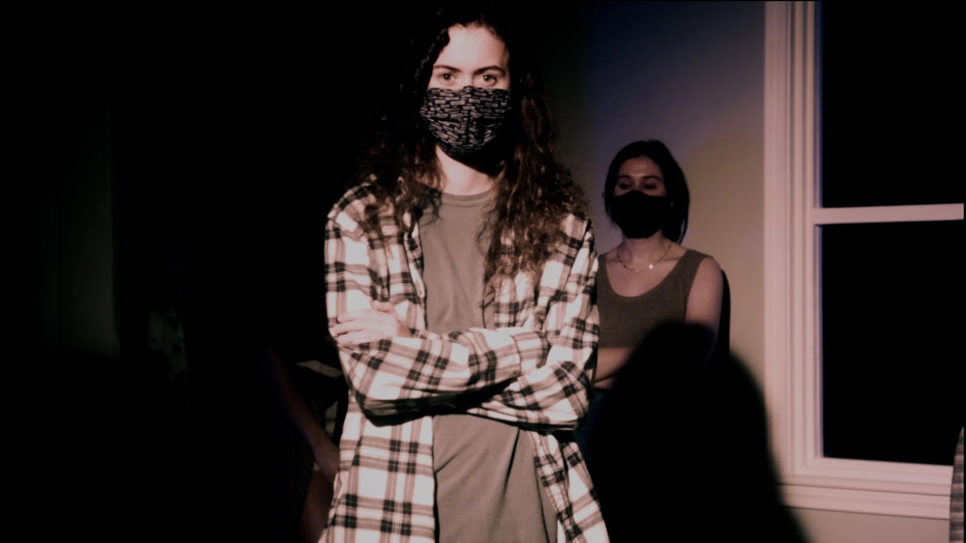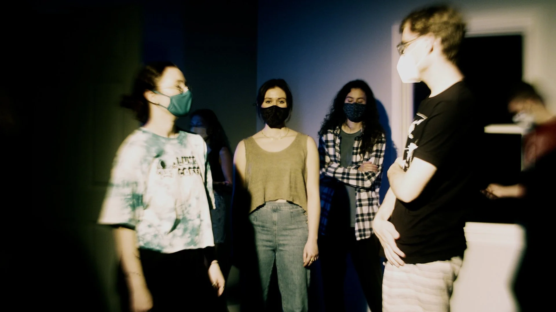 We had a Mole Richardson 2K Studio Light, added some CTO and used a flicker box to control the strobe. We also added some haze (because it’s a party, why not) and my students wanted to use LED tube lights to cast a blue light on the back wall.